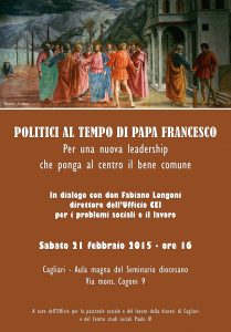 Gli scorsi anni questo evento è stato realizzato in occasione della festa liturgica di Sant’Efisio, il 15 gennaio. Quest’anno è stato deciso di valorizzare la presenza di mons. Fabiano Longoni, direttore dell’ufficio della CEI per i problemi sociali, che tra sabato e domenica sarà in visita in Sardegna per incontrare i delegati diocesani di questo settore pastorale e gli animatori del Progetto Policoro presenti nelle diverse diocesi isolane.
